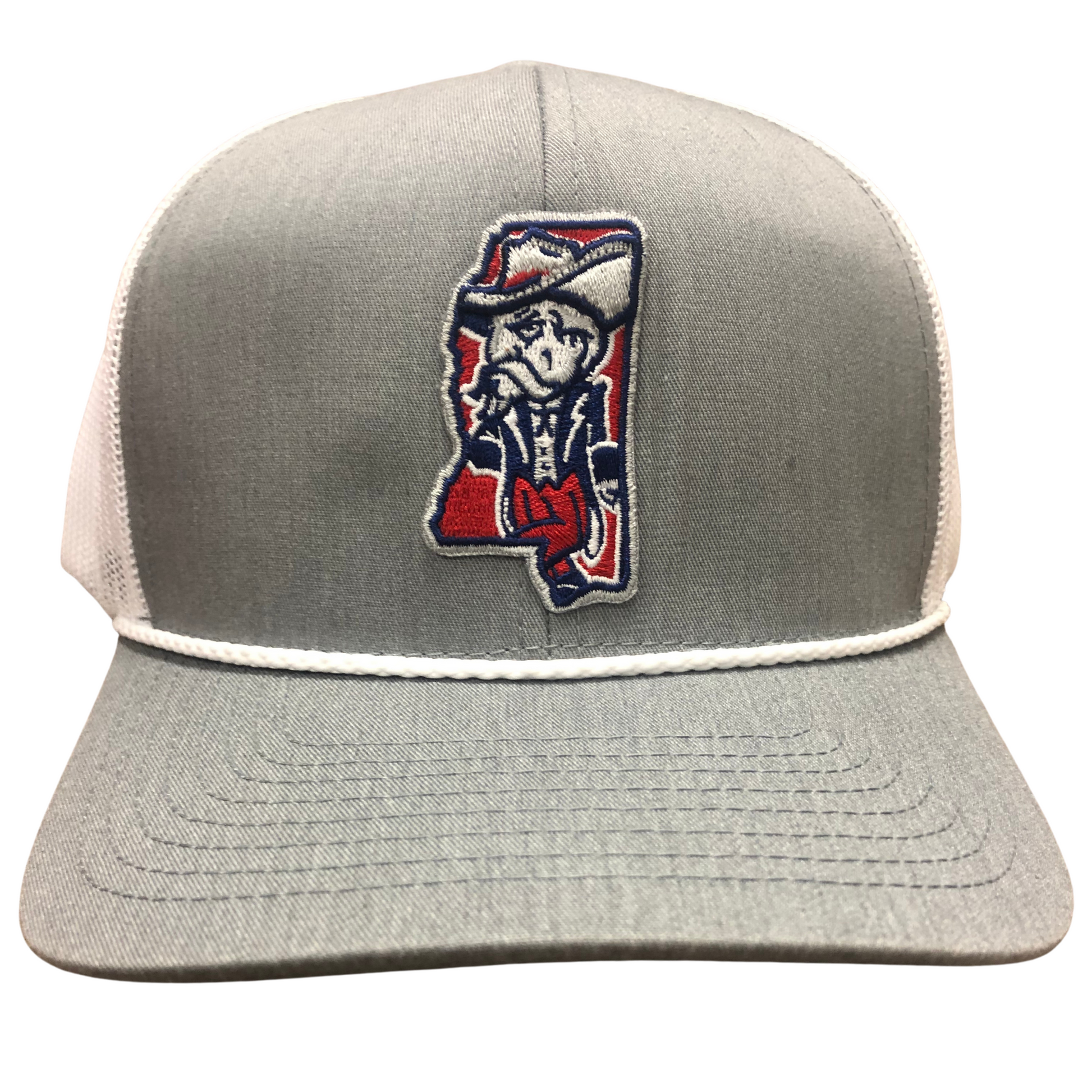 Featuring the traditional Colonel Reb pose inside the outline of Mississippi. 3-D embroidery on front.
