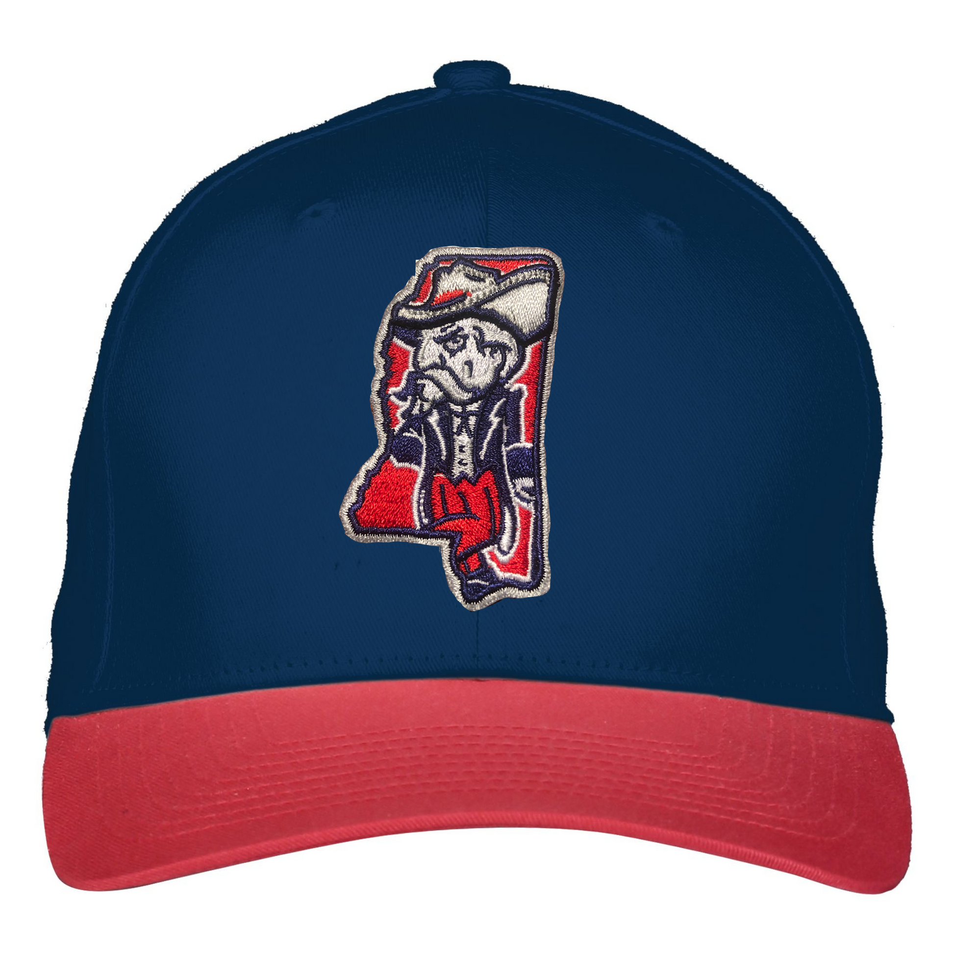 Featuring the traditional Colonel Reb pose inside the outline of Mississippi. 3-D embroidery on front.