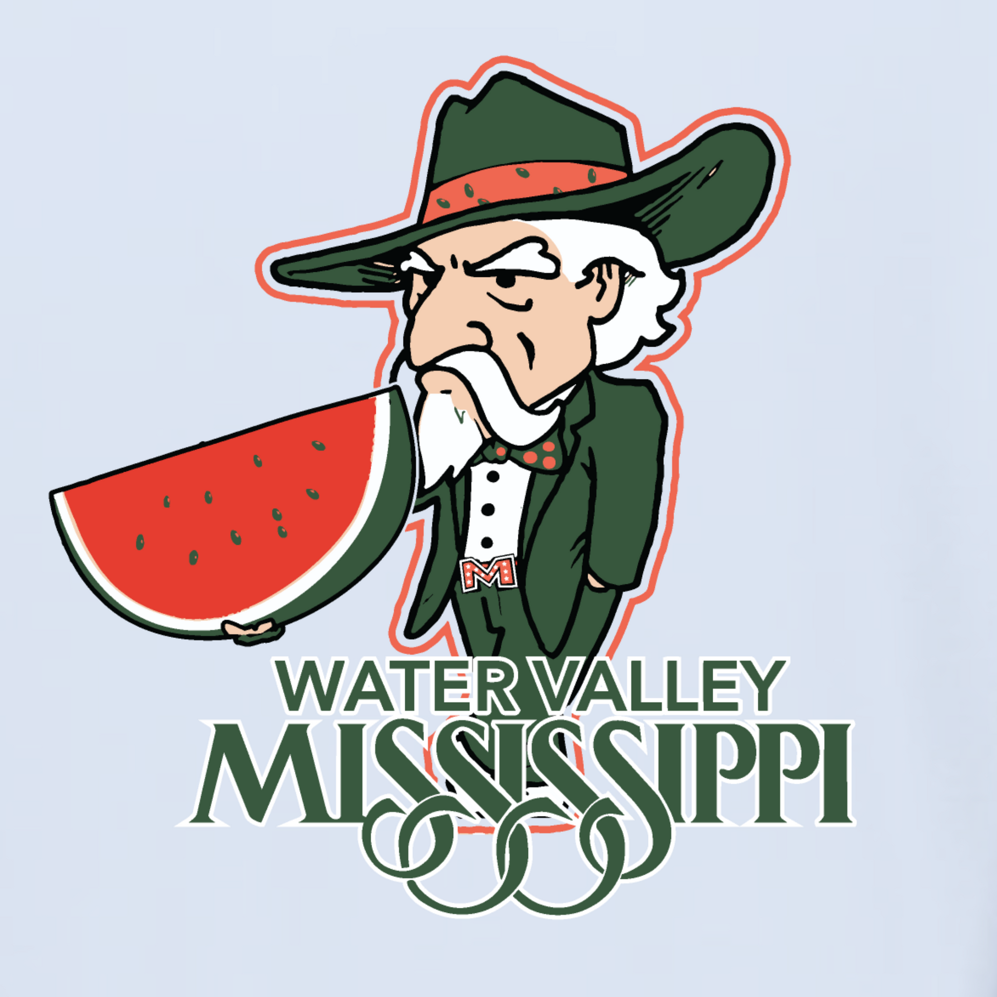This 3.25"x3" bumper sticker features watermelon-toting Colonel Reb, as he promotes the North Mississippi town of Water Valley. This sticker offers vibrant colors that won't fade over time, even when exposed to sunlight and harsh weather conditions.