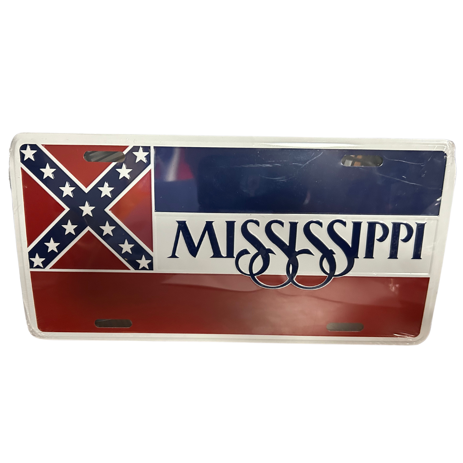 This one-of-a-kind license plate features the historic flag of Mississippi and the famous Mississippi "cursive letters" script.